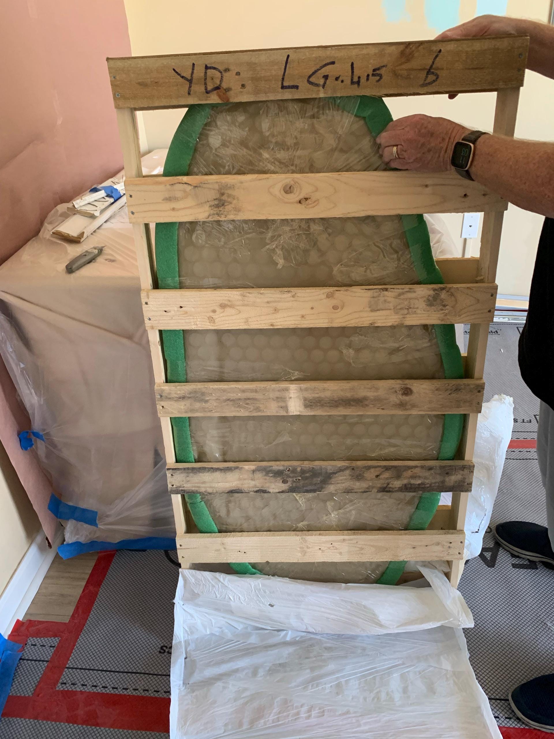 The mirror comes to you wrapped in foam in a wooden crate. If it is broken or any other problem, we will send a new one immediately. (We've never had a broken mirror)
