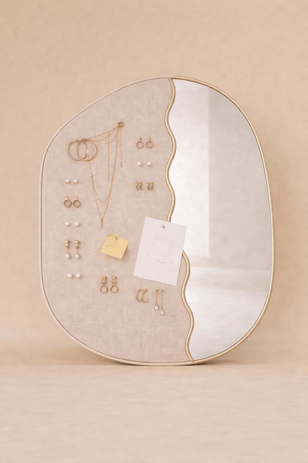 With its soft curves and minimalist design, it works not only as a jewelry organizer but also as a decorative mirror that adds warmth and style to your space.